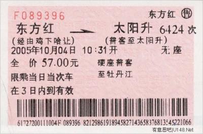 “東方紅”站位于現(xiàn)在虎林市與饒河縣之間的密東鐵路的盡頭站,而車票中顯示的“太陽升”站,是位于黑龍江省大慶市大同區(qū)太陽升鎮(zhèn)的“太陽升”火車站。這張2005年的車票顯示,由“東方紅”至“太陽升”需要經(jīng)過多次轉(zhuǎn)車,而售出這張車票的是“東方紅”火車站。水妖昨日打電話詢問該站工作人員得知,票上的“雞下哈讓”分別代表4個中轉(zhuǎn)地:雞西、下城子、哈爾濱、讓湖路。這樣的車票現(xiàn)在還可以買到,不過當(dāng)年的車次已經(jīng)改變,現(xiàn)在這條路線的車次應(yīng)該是6224次。