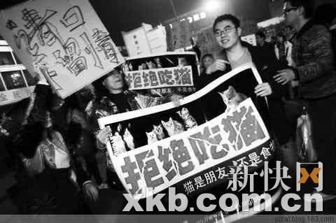在廣場上,一見“聞貓即興”等人出來了,其他人都著急地圍上去詢問。盡管結(jié)果不是太讓人滿意,但大伙還是決定在廣場上舉行一次小型的抗議活動。100多人圍在一起,高舉著“請發(fā)揚(yáng)人道主義,放過它們”、“請口下留情”、“拒吃貓肉”等紙牌,喊著口號。并有細(xì)心的網(wǎng)友拿著印制好的傳單,向候車的乘客宣傳“不吃貓肉”。對此,路人大都報(bào)以一笑。