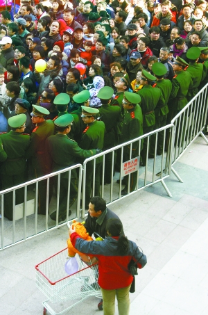 “新店開(kāi)張,油、米、面、肉低價(jià)促銷(xiāo),還發(fā)券,能不吸引人嗎?”李先生說(shuō),昨日上午9時(shí)許,他原準(zhǔn)備趕在超市剛開(kāi)門(mén)就進(jìn)去轉(zhuǎn)轉(zhuǎn)。但一到萬(wàn)達(dá)廣場(chǎng),只見(jiàn)家樂(lè)福門(mén)口聚集著大量顧客,數(shù)百人的隊(duì)伍早就排至數(shù)十米外,并還在不斷膨脹。為維持秩序,工作人員在隊(duì)伍兩側(cè)安置了簡(jiǎn)易護(hù)欄,同時(shí),數(shù)十名武警一字站開(kāi),引導(dǎo)眾人進(jìn)入超市。
