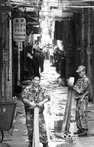 昨日上午10點半左右,記者趕到南洲街出事現(xiàn)場,看到大火已被撲滅,出事現(xiàn)場拉起了警戒線,幾名警察正在勘查,十幾名治安管理員疏散在警戒線內的商鋪人員。由于起火點位于城中村中心地帶,也是該城中村的主干道,引起了附近街坊的圍觀,給城中村的交通帶來了一些阻滯。