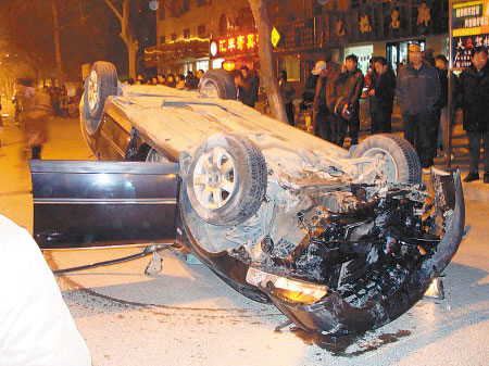 昨天晚上9點(diǎn)40分左右,渭南市建設(shè)局一位副局長(zhǎng)的小轎車(chē)在東風(fēng)大街逆行百余米,從綠化帶越過(guò)并撞倒10多米高的路燈桿后四輪朝天。事故造成人行道上一位騎自行車(chē)帶著4歲孩子的母親死亡,孩子受傷被送醫(yī)院治療。 記者 石俊榮 攝