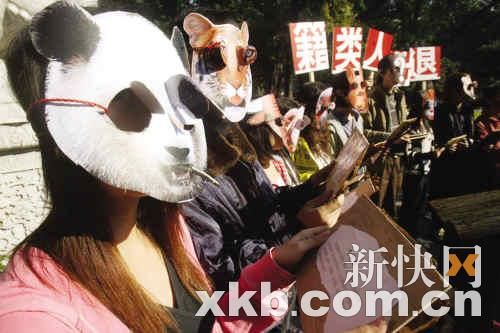 多名自發(fā)組織的志愿者頭戴面具,用行為藝術呼吁保護動物。許都/攝