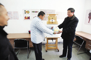 捐贈儀式上,張金寶代表同伴們從蔣卓平手中接過了畫筆等繪畫材料,兩年來他想繼續(xù)畫畫的心愿終于實現了。對最具天才的張金寶來說,他并不著急動筆,他摸摸自己腦袋告訴記者說:“好長時間不畫了,腦子有點空,畫什么我要再想想……”