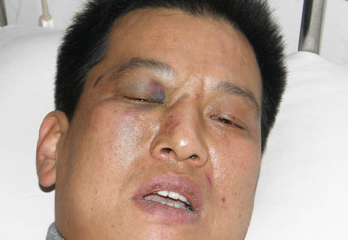據(jù)他回憶說,12月15日下午,我在杜康花園小區(qū)尚要武家等車去灌液化氣,大約4點鐘左右,一伙不明身份的人(后獲悉是該縣刑警)闖進家中,一人摟著我脖子用手槍指著我頭不讓動,將我摔在地上,另一人將我皮帶抽掉,又把鞋子脫掉,對我搜身,將電話拿走,我說我沒辦違法事,控制我的人用手槍在我頭上砸了兩下說:“不準(zhǔn)說話,不許動。”此人用膝蓋頂著我脖子,我呼吸困難,我說我出不來氣,掙扎了一下,此人用槍在我頭上砸了一下,又有一人在我胸口跺了兩腳,走到我左側(cè)朝我面部、頭上猛跺,隨后將我背銬手銬塞上車(非警車)。