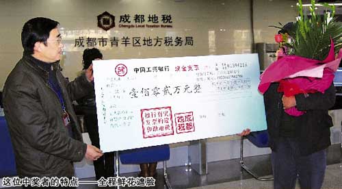 防寒服的帽子將頭捂得嚴嚴實實,一束鮮花遮著半邊臉。昨日上午,(成都)青羊地稅局來了個神秘人物。他就是自稱張靜的102萬有獎發(fā)票大獎得主。據(jù)青羊地稅局負責人介紹,他是我市推出有獎發(fā)票以來最高獎金的首個得主。