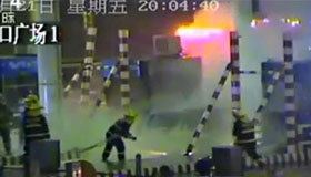 南京:收費站汽車自燃 眾人合力滅火