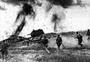 戰(zhàn)爭(zhēng)初期,蘇軍積極防御。1941年10月─1942年1月,蘇軍殲敵50多萬(wàn),取得了莫斯科會(huì)戰(zhàn)的勝利,使希特勒“閃電戰(zhàn)”慘遭失敗。1942年11月19日,蘇軍展開反攻,次年,迫使希特勒轉(zhuǎn)入戰(zhàn)略防御。
