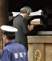 10月17日,日相小泉無(wú)視亞洲各國(guó)的強(qiáng)烈反對(duì)再次參拜供奉有二戰(zhàn)日本甲級(jí)戰(zhàn)犯的靖國(guó)神社。對(duì)此,中國(guó)外交部發(fā)表聲明,嚴(yán)厲譴責(zé)小泉“拜鬼”。中國(guó)駐日本大使王毅也在東京緊急約見(jiàn)日本外相町村信孝,向日方提出強(qiáng)烈抗議。 |