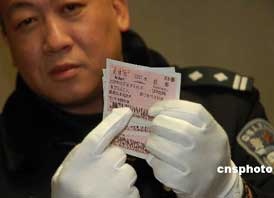 假票主要有“回頭票”、“補(bǔ)、涂改票”、“整版假票”三種;仡^票一般票面較舊,且已被剪口;補(bǔ)、涂改票由于刮掉了一部分纖維,顏色會(huì)有些發(fā)白,整個(gè)票面顏色不統(tǒng)一;而假票票面“中國鐵路”標(biāo)志以及背面的水印較為模糊,用手輕揉票面文字及數(shù)字時(shí),油墨即會(huì)沾在手上。
