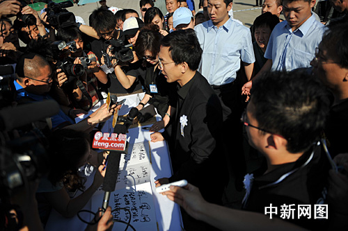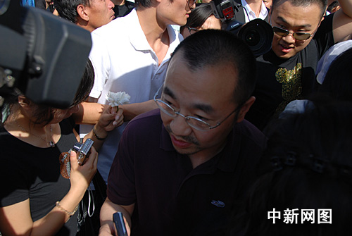 圖:中國傳媒大學(xué)學(xué)生手捧白花送別師兄羅京