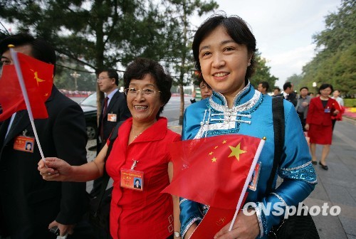 圖:少數(shù)民族代表手持五星紅旗步入慶典現(xiàn)場
