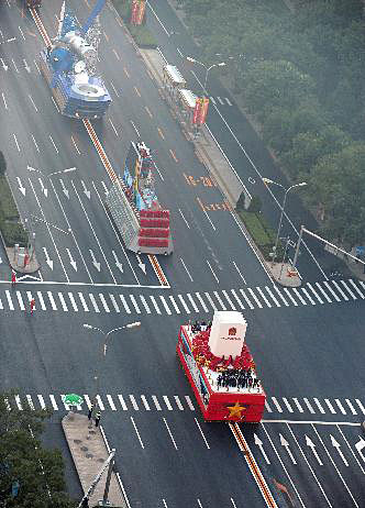 圖:國慶游行彩車向長安街指定地點集結(jié)
