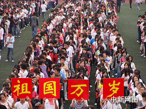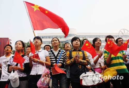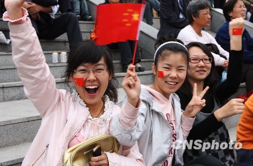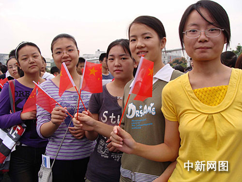 圖:黑龍江大學生揮舞國旗為祖國歡呼