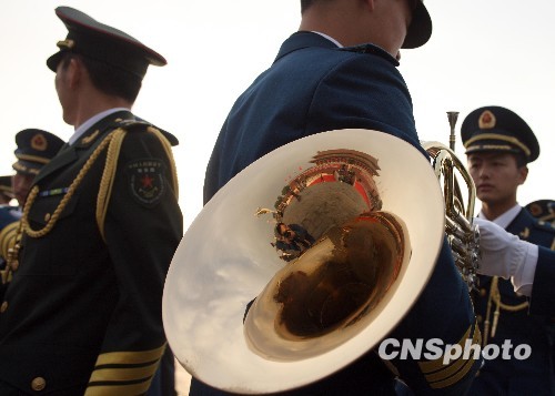 圖:國慶盛典前軍樂隊號手認真準備