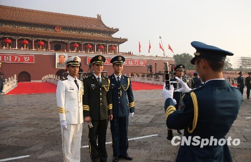 圖:軍樂隊隊員在天安門前合影