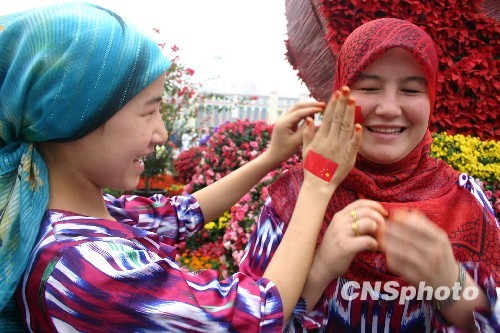 圖:新疆維吾爾族姐妹臉貼國旗裝