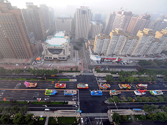 圖:國慶游行彩車向指定地點集結(jié)