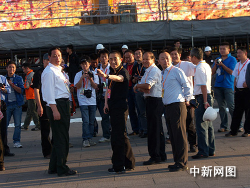 圖:張藝謀指導工作人員安裝網(wǎng)幕煙花