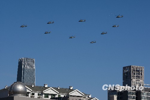 國(guó)慶閱兵:直升機(jī)梯隊(duì)飛過北京上空