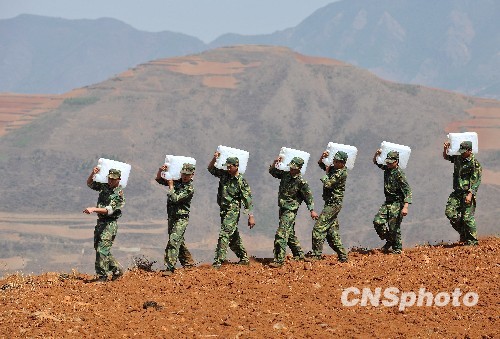 圖:消防官兵為貴州黔西南旱區(qū)百姓送水