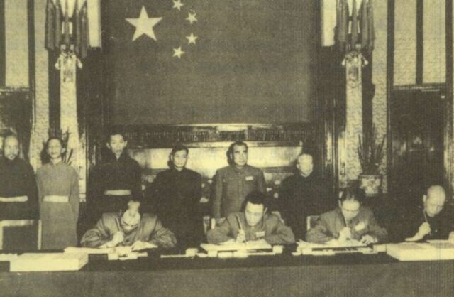 中央人民政府全權(quán)代表和西藏地方政府全權(quán)代表經(jīng)過談判之后,對和平解放西藏取得了一致的意見。一九五一年五月二十三日,《中央人民政府與西藏地方政府關(guān)于和平解放西藏辦法的協(xié)議》在北京正式簽訂。簽字儀式由中央人民政府副主席朱德、李濟(jì)深,中央人民政府政務(wù)院副總理陳云主持。