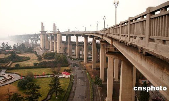 南京長江大橋江中正橋共有9墩10孔,每個(gè)橋墩高80米,每墩底部面積400多平方米,比一個(gè)籃球場(chǎng)還大,最高的橋墩從基礎(chǔ)到頂部高85米。墩與墩之間的距離除北岸第一孔是128米外,其余9孔均為160米,橋下可行萬噸巨輪。正橋兩端有4座70多米高的橋頭堡。整座大橋如彩虹凌空江上,巖床埋在正橋河床33~47米以下,9個(gè)橋墩基礎(chǔ)分別采用重型混凝土沉井、鋼沉井加管柱、浮式鋼筋混凝土沉井、鋼板樁圍堰管柱等基礎(chǔ)。正橋10孔鋼筋梁中9孔為160米跨度,采用優(yōu)質(zhì)合金鋼桿件在現(xiàn)場(chǎng)鉚接拼裝架設(shè)。