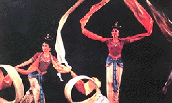 舞蹈《飛天》不僅是當代中國第一部取材于敦煌壁畫的舞蹈作品,同時也是繼承戲曲中的長綢舞并加以發(fā)展、創(chuàng)新,使之成為獨立的純舞蹈藝術的第一部成功之作。從1954年首演至今,經久不衰。