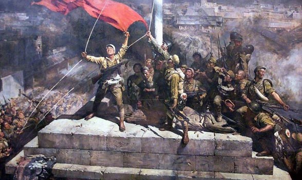 《占領(lǐng)總統(tǒng)府》表現(xiàn)的是中國人民解放軍占領(lǐng)南京總統(tǒng)府,升上紅旗的場面,標(biāo)志著蔣家王朝的滅亡,新中國的開始。作品場面壯觀,氣勢恢弘。畫家用現(xiàn)實主義的創(chuàng)作方法使這一歷史題材的創(chuàng)作具有紀(jì)念碑的意義。