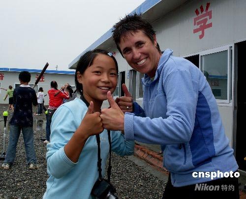 圖:美國(guó)職業(yè)女壘隊(duì)在綿竹鼓勵(lì)災(zāi)區(qū)學(xué)生
