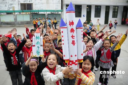 圖:常萬全家鄉(xiāng)小學(xué)生!吧裰燮咛枴卑l(fā)射成功