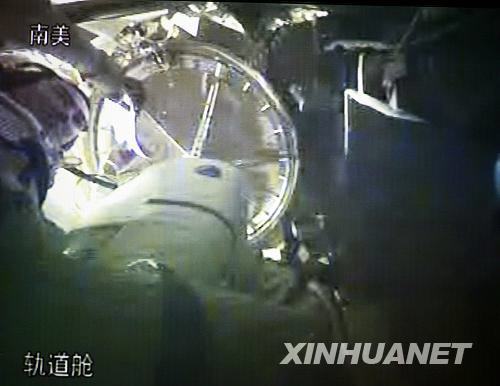 圖:“神七”軌道艙進(jìn)行艙門檢漏