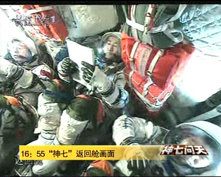 圖:神舟七號返回在即航天員穿好艙內(nèi)服