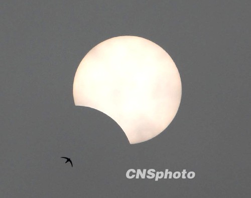 中國各地觀測日食奇觀:北京上空燕子陪伴日偏食