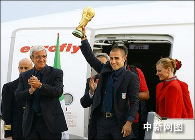 中新網7月12日電 據(jù)新京報報道,第四次登頂世界杯的意大利隊昨天凌晨乘坐專機回到了祖國,當飛機在羅馬郊區(qū)的海軍機場著陸后,一場席卷意大利全國的慶;顒永_了序幕。意大利隊全體成員被授予共和國勛章。