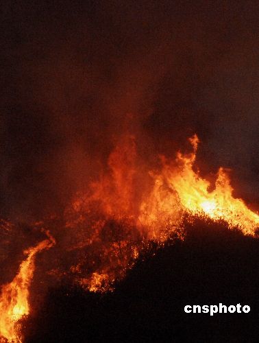 美國(guó)加州火災(zāi)最重的圣地亞哥,海軍陸戰(zhàn)隊(duì)大本營(yíng)所在地的十月二十四日還在燃燒。連日肆虐的山火目前已造成至少十億美元的經(jīng)濟(jì)損失,近一百萬(wàn)民眾被下令疏散到各個(gè)避難收容場(chǎng)所。布什總統(tǒng)將改在周五前往加州災(zāi)區(qū)視察。中新社發(fā) 賈國(guó)榮 攝