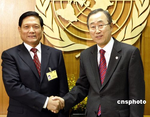 中共中央政治局委員、北京市委書(shū)記、北京奧組委主席劉淇三十一日在紐約聯(lián)合國(guó)總部與聯(lián)合國(guó)秘書(shū)長(zhǎng)潘基文舉行會(huì)晤。中新社發(fā) 李靜 攝