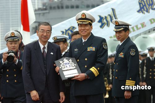 圖為日本東京都代表向訪日艦隊指揮官、南海艦隊副司令肖新年少將贈送紀念品。