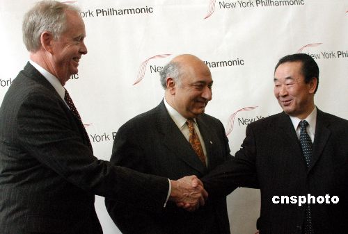 紐約當(dāng)?shù)貢r(shí)間十二月十一日,世界著名樂(lè)團(tuán)紐約愛(ài)樂(lè)樂(lè)團(tuán)正式宣布二00八年二月訪問(wèn)朝鮮,在平壤舉辦音樂(lè)會(huì)。當(dāng)日,朝鮮常駐聯(lián)合國(guó)代表樸吉淵出席有關(guān)新聞發(fā)布會(huì)時(shí)表示,他深信此舉將有助于朝美之間加強(qiáng)文化關(guān)系,增進(jìn)兩國(guó)人民的相互理解。圖為紐約愛(ài)樂(lè)樂(lè)團(tuán)主席保羅‧庫(kù)恩達(dá)(左)、團(tuán)長(zhǎng)扎林·梅塔(中)和樸吉淵在發(fā)布會(huì)后握手互祝訪問(wèn)成功。中新社發(fā) 李靜 攝