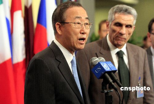 聯(lián)合國秘書長潘基文(左)二十七日發(fā)表聲明,對巴基斯坦前總理、人民黨領(lǐng)袖貝·布托遇刺表示“震驚和憤怒”。他呼吁巴人民在此“困難時期”保持冷靜和克制,為和平和民族團結(jié)共同努力。中新社發(fā) 李靜 攝
