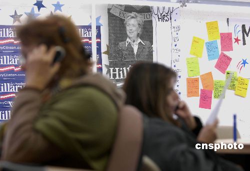 二零零七年的最后一個(gè)周末,美國(guó),設(shè)于舊廠房中的希拉里舊金山競(jìng)選總部的義工們加班加點(diǎn),給愛荷華州的選民打電話,號(hào)召民主黨的選民們?yōu)橄@锿镀。中新社發(fā) 陳鋼 攝