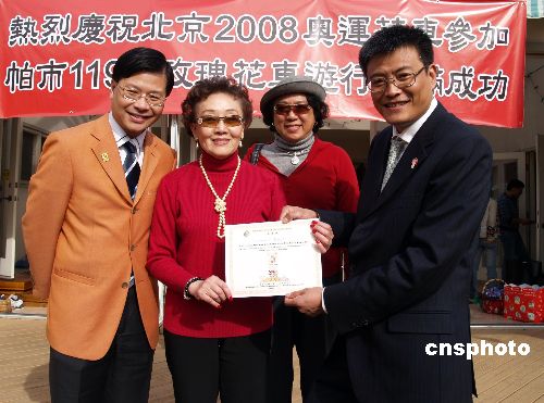 當(dāng)?shù)貢r(shí)間1月1日下午,南加州華人社團(tuán)聯(lián)合會舉行派對,慶祝北京奧運(yùn)玫瑰花車在美國洛杉磯第119屆帕薩迪娜玫瑰花車游行中勇奪“最佳主題大獎(jiǎng)”。參加玫瑰花車表演的北京二中學(xué)生、中國雜技團(tuán)和中國京劇院演員122人露出勝利歡笑。北京奧運(yùn)組委會新聞宣傳部長蕭培向南加州華人社團(tuán)聯(lián)合會主席張素久頒感謝狀,感謝華人華僑對北京奧運(yùn)的支持。中新社發(fā) 盧威 攝
