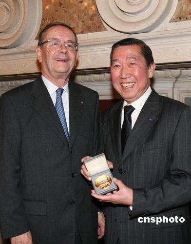 當?shù)貢r間1月7日,法國納伊市市長巴依向旅法僑界知名華裔人士何;(右)頒授榮譽獎章,以表彰他為促進法中友好與合作及亞裔融入法國社會做出的積極貢獻。與法國總統(tǒng)薩科奇相識三十多年的何福基,是該市的一位知名人士,2007年底薩科奇首次訪華時,何福基曾作為代表團中唯一的華裔人士隨同訪問。中新社發(fā) 鐘誠 攝