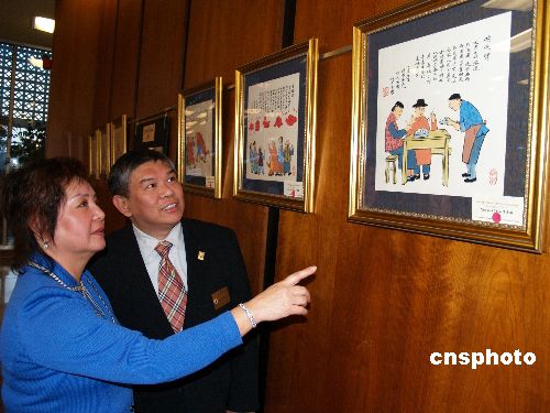2008年1月9日,華人聚集的洛杉磯阿罕伯拉市舉行中國年畫拍賣會,為阿罕伯拉市高中籌集教育基金。成都女畫家陳雪梅的12幅鼠年年畫,為美國中學(xué)生籌得近5000美金。阿罕伯拉市華裔市長沈時康、拍賣活動負責(zé)人陳惠萍欣賞中國年畫。中新社發(fā) 盧威 攝