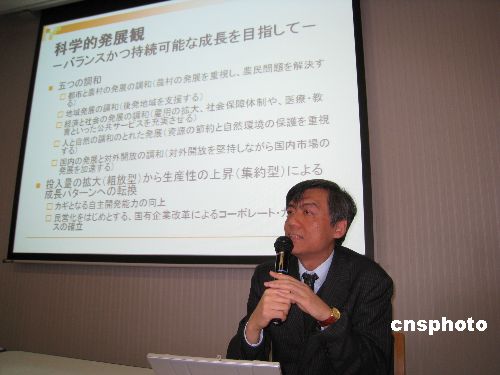 1月19日,由早稻田大學中國塾(研究會)主辦的2008年新春演講會,在早稻田大學國際會議中心舉行,百余人與會。旅日華人學者、知名中國經濟專家關志雄博士進行演講。圖為關志雄在介紹中國的科學發(fā)展觀。中新社發(fā) 段躍中 攝