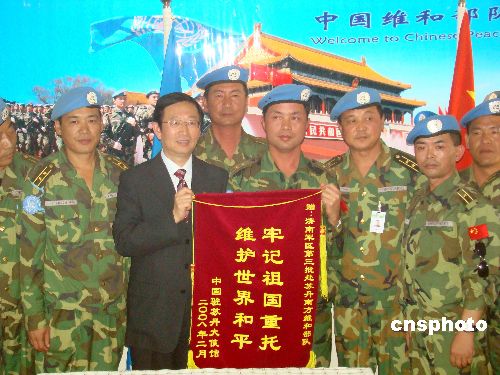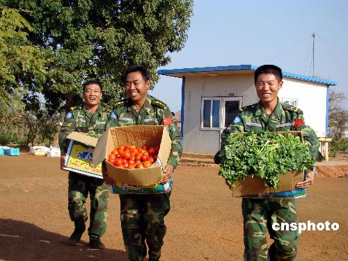 當?shù)貢r間2月3日下午,中國駐蘇丹大使李成文在董建東武官的陪同下,帶領中國石油天然氣集團公司代表一行5人乘專機前往蘇丹南部城市瓦烏,慰問中國駐蘇丹維和工兵、運輸、醫(yī)療分隊。李大使代表中國駐蘇丹大使館向維和部隊贈送一面鑲有“牢記祖國重托、維護世界和平”字樣的錦旗及慰問品。隨同的中國石油天然氣集團公司代表向維和部隊贈送1000余公斤新鮮蔬菜。中新社發(fā) 劉恩海 攝