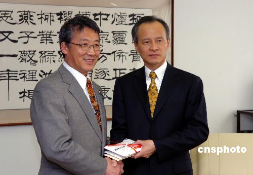 2月7日,日本執(zhí)政黨之一的自民黨國際局長三原朝彥(左)來到中國駐日使館,代表該黨向中國雨雪災(zāi)區(qū)捐款。中國駐日大使崔天凱作為中國政府代表接受此項(xiàng)捐款。中新社發(fā) 滕劍峰 攝