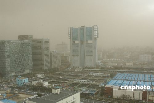 2月23日午后,東京出現(xiàn)大風(fēng)天氣,瞬間風(fēng)力達(dá)到15.9公里,一時(shí)間,黃沙漫天。圖為東京都港區(qū)的高層建筑群浸潤(rùn)在黃色沙塵中。中新社發(fā) 滕劍峰 攝