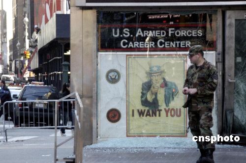 圖:紐約時(shí)代廣場(chǎng)一征兵點(diǎn)門(mén)口發(fā)生爆炸