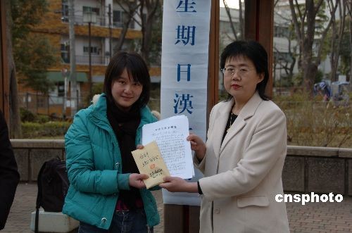 3月9日,日本東京漢語(yǔ)角舉行的第30次交流會(huì)上,日本僑報(bào)社社長(zhǎng)張景子(右)代表中日兩國(guó)的捐款者,把全部捐款和寫給湖南省長(zhǎng)周強(qiáng)的信,轉(zhuǎn)交給了正在日本訪問(wèn)的湖南省人民對(duì)外友好協(xié)會(huì)干部曾卓然(左),表達(dá)大家對(duì)湖南災(zāi)區(qū)人民的關(guān)切之情。近一個(gè)月來(lái),日本僑報(bào)社組織的為湖南災(zāi)區(qū)人民捐款活動(dòng),共收到4個(gè)團(tuán)體、53位日本友人和在日華人的全部捐款38.2885萬(wàn)日元。中新社發(fā) 段躍中 攝