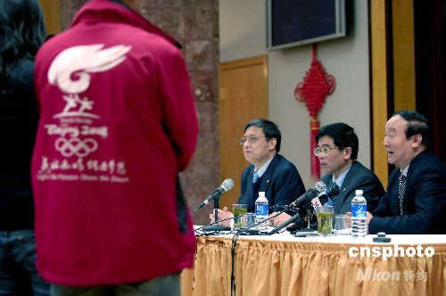 當(dāng)?shù)貢r(shí)間四月十日,中國(guó)駐美大使周文重(右三)和北京奧組委執(zhí)行副主席蔣效愚(右一), 在舊金山舉行記者會(huì),感謝華人華僑對(duì)北京奧運(yùn)會(huì)的支持和美國(guó)人民對(duì)圣火傳遞的熱情參與。中新社發(fā) 陳鋼 攝